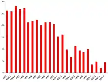 In 1972 Waldeck Rochet was succeeded as secretary-general by Georges Marchais, who had effectively controlled the party since 1970. Marchais began a moderate liberalization of the party's policies and internal life, although dissident members, particularly intellectuals, continued to be expelled. The PCF formed an alliance with Mitterrand's new Socialist Party (PS). They signed a Common Programme before the 1973 legislative election. The Common Programme marked the PCF's acceptance of democratic principles and civil liberties, and included major institutional, economic and social reforms.[18] The PCF believed, like in 1936, that it would gain the upper hand over the PS and quickly decimate their socialist rivals. On the contrary, however, the PCF was weakened by the alliance with the PS. In the 1973 elections, the PCF increased its support—winning 21.4% and 73 seats—but the distance separating it from the PS was reduced, with Mitterrand's PS winning 19.2%.