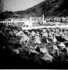 During the second half of the nineteenth century (after 1850s), steamships began to be used in the pilgrimage journey to Mecca, and the number of pilgrims traveling on sea route increased.[27] With the opening of Suez Canal in 1869, the travel time for pilgrimage was shortened.[28] Initially, the British ship companies had a monopoly in these steamship business and they offered little facilities to the pilgrims. In 1886, the then government of India adopted some regulations to improve the pilgrimage journey from India to Hejaz.[29] During the early twentieth century, the Ottoman Sultan Abdul Hamid II constructed the Hejaz Railway between Damascus and Medina which further facilitated the pilgrimage journey: the pilgrims traveled in relative ease and reached Hejaz in only four days.[30] Starting from Damascus in September 1900, the railway reached Medina in September 1908 having a span of 1,300 kilometers (810 mi).[31][32] The railroad was damaged during the First World War by an Arab Revolt force led by British officer T. E. Lawrence.[33][30] Plague used to break out almost every year until 1918.[34]