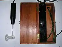 - ↑ The small high voltage coils in these home violet ray wands resembled induction coils more than Tesla coils; they had iron core transformers and mechanical interrupters and produced lower voltages, 30 - 80 kV, than Tesla coils