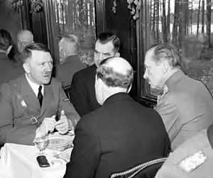 After the official speeches, Damen continued to record the now-private conversation, with Hitler unaware that the conversation was still being recorded.[6][3][9] After eleven minutes, Hitler's SS guards realized what Damen was doing and made a cutthroat gesture to demand that he cease recording.[3][6][7][9] The SS guards demanded the tape be destroyed, but YLE was allowed to keep the tape in a sealed container with the promise that it never be opened again.[3][7][9] The tape was given to the head of the State Censors' Office, Kustaa Vilkuna, returned to YLE in 1957, and made publicly available a few years later. It is the only known recording of Hitler speaking in an unofficial tone and one of the very few recordings in which Hitler may be heard delivering a narrative without raising his voice.[9]