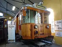 The electric motor coach HKB 110 of Holmenkollbanen from 1930 at Sporveismuseet in Oslo.