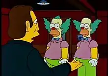 Brad Bird also helped Silverman, particularly with Krusty's design.[4] An early idea for The Simpsons saw Krusty the Clown being revealed as Homer Simpson's secret stage identity. This storyline never developed, but this episode allowed writers to comment upon the design similarity of the two characters. Krusty's appearance and design is just that of Homer's, with clown make-up.[7] Silverman enhanced the lines under Krusty's eyes, and reshaped his beard line in order to make a clearer distinction between the two characters.[4]