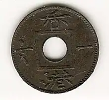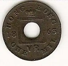 The one mil coin was the smallest denomination of the Hong Kong dollar from 1863 to 1866, after this date it was no longer issued but may have circulated much longer. Its value was one tenth of a cent, or a thousandth of a dollar. It was minted by the Royal Mint, it features the Royal cypher of "VR", of the reigning monarch Queen Victoria at the time, but didn't feature a profile of the face of the monarch as all other coins did, due to the hole in the middle.