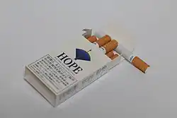 ![]() A Japanese pack of Hope cigarettes, with a text warning displayed | |