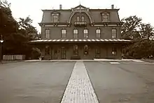 The first railroad to reach Hopewell was the Mercer and Somerset Railway, which was backed by the Pennsylvania Railroad. It was created largely to protect the monopoly the Pennsylvania Railroad had on New Jersey, by cutting off the first separately owned railroad in New Jersey, the Delaware and Bound Brook Railroad, by being built in the way of it. It was completed in 1874. The Delaware and Bound Brook reached Hopewell in 1876, but the railroad had to cross the Mercer and Somerset's track just to the northwest of Hopewell. A dispute occurred at the crossing, known as a frog, and escalated into each company parking locomotives over the crossing to prevent the other company from moving trains over it. Eventually, militia had to be called in to keep the peace, and the Delaware and Bound Brook prevailed.[37] Soon after the Frog War the Mercer and Somerset was liquidated having failed at its purpose. Some of the abandoned right of way for the Mercer and Somerset in Hopewell became Model Avenue. The Delaware and Bound Brook was leased by the Philadelphia and Reading in 1879 for 999 years[38] and has become the CSX Trenton Line and is still in use today. The Frog is also what gives Hopewell Elementary school its mascot, "Freddy the Frog" in honor of the Hopewell frog war.[39]