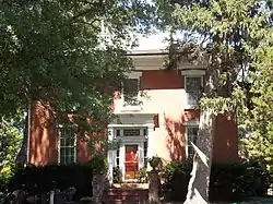 The Horace Anthony House is a 2½-story brick dwelling built on a limestone foundation. The brick was locally produced. The main block is a cube-shape that measures roughly 36 by 29 feet (11.0 by 8.8 m) and it has a full basement.[2] There is a single-story wing on the back, and a porch on the east side and one on the west side. Both the main block and the back wing are capped with a hipped roof. The main block has a flat deck on top of the roof. It also exhibits wide overhanging eaves with a bracketed cornice from the Italianate style. The pedimented hoods located over the windows and doors, and the main entry with its classical detailing and side lights and transom are characteristic of the Greek Revival style. The ceilings on the first floor are 9.5 feet (2.9 m) high.[2] The two windows in the front of the house go from ceiling to floor. In the center of the main block is a spiral staircase that rises from the main floor to the roof deck.