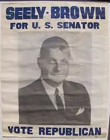 Elected as a Republican to the Eightieth Congress Seely-Brown served from January 3, 1947, to January 3, 1949, and was an unsuccessful candidate for reelection in 1948 to the Eighty-first Congress. He was elected to the Eighty-second and to the three succeeding Congresses, and served from January 3, 1951, to January 3, 1959, before becoming an unsuccessful candidate for reelection in 1958 to the Eighty-sixth Congress. Seely-Brown voted in favor of the Civil Rights Act of 1957,[4] but voted present on the 24th Amendment to the U.S. Constitution.[5] He was elected in 1960 to the Eighty-seventh Congress and served from January 3, 1961, to January 3, 1963.[6] In 1962 he was the Republican candidate for the US Senate seat of retiring Republican Prescott Bush and was defeated in a close race with the Democratic former governor, Abraham Ribicoff, receiving 48% of the vote. After political office, he resumed agricultural pursuits and resided in Pomfret Center, Connecticut.
