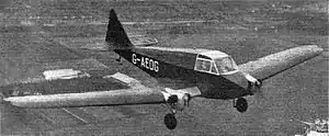 Construction was primarily wooden, with plywood skinned frames. The wings were cantilever, and could be folded outboard of the engines.[1] The fixed main undercarriage legs were inline with the engines, with no brakes and a simple tail skid. The Autoplane was fitted with a control system by which all manoeuvres could be carried out using one hand. At the top of each of the normal control columns there was a small wheel which took the place of the more usual rudder bar or pedals. No wing flaps or pilot-operated trimmers were provided.