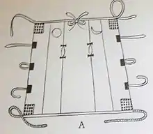 A horo was around 1.8 m (6 ft) long and made from several strips of cloth sewn together with a fringe on the top and bottom edges. The cloth strips were sewn together and formed into a sort of bag which would fill with air like a balloon when the wearer was riding a horse.[1] A light framework of wicker, bamboo or whale bone known as an oikago, similar to a crinoline, which is said to have been invented by Hatakeyama Masanaga during the Ōnin War (1467–1477),[2] was sometimes used to keep the horo expanded. Attaching the horo generally involved a combination of fastening cords and possibly a staff. The top cords were attached to either the helmet or cuirass of the wearer while the bottom cords were attached to the waist.[3] The family emblem (mon) of the wearer was marked on the horo.[1]