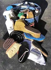 - Bristle brush: A stiff bristle brush used to remove the dirt, hair and other material stirred up by the curry. Brushes are used in the direction of the horse's hair coat growth, usually in short strokes from front to back except at the flanks where the hair grows in a different pattern.