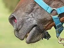 Chewing is a combination of licking and mastication, during which the mouth is open and the tongue clearly visible, causing the horse to secrete saliva.[21] This behavior can have many reasons and meanings, including submission, relaxation or well-being, but also discomfort.[21] In its natural state, a horse chews when waiting for its turn to drink, when standing up and expressing relaxation after a rest, but also to soothe and show submission to a fellow horse.[21] When relaxed, the horse may chew with light chewing movements.[23] However, the horse may also yawn, chew and shake its head during ambivalent behaviors resulting from behavioral disorders.[24]