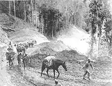 British troops in the Mediterranean theatre of war continued the use of horses for transport and other support purposes. The horses used were from local as well as imported sources. As an example the Sherwood Foresters infantry regiment, relocated to Palestine in 1939, brought with them a thousand English horses.[100] Two mounted cavalry regiments were already present in this region. Lack of vehicles delayed planned motorization of these troops well into 1941.[100] In 1942 the British still employed 6,500 horses, 10,000 mules and 1,700 camels, and used local mules in Sicily and mainland Italy.[101]