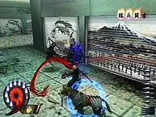 Combat is hack and slash-based,[6] involving large numbers of recurring enemies.[4] Hotsuma's sword, Akujiki, is his primary weapon. Akujiki feeds on souls, initially devouring those of the enemies he kills, then that of Hotsuma himself if he does not kill any enemies for too long. This leads to an emphasis on killing all enemies in a battle as quickly as possible. To ensure that Akujiki's hunger remains sated, Hotsuma can kill four or more enemies with no more than a few seconds between each kill to perform an exaggeratedly violent "TATE" attack that will release more souls for Akujiki. The mechanic of jumping from enemies after dispatching them adds an element of platform gameplay.[7]