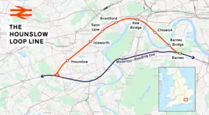 The Hounslow Loop Line is a railway line in southwest London which was opened by the London and South Western Railway in 1850. It leaves the Waterloo to Reading Line at Barnes Junction and after some seven and a half miles rejoins it at a triangular junction between Whitton and Feltham. Barnes Railway Bridge carries the line over the River Thames. Passenger services, all operated by South Western Railway, either loop back to Waterloo by the junctions or continue southwest via Feltham. The line is electrified at 750 V DC (third rail). It provides access to the North London Line for freight services both passing through Clapham Junction to the north east and connecting to the rail network to the south west.