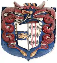 John I Lovering (died 1675) was a merchant of Weare Giffard. The Lovering family held at some time the north Devon manor of Bittadon.[24] It is not clear how he came to reside at Hudscott; Andrews (1958) suggested that John I Lovering was a nephew of William Venner, and that at some time before his death in 1690 Venner had handed over the estate to Lovering. He married Dorcas Doddridge,[25] sister and co-heiress of John Doddridge (1610-1666), MP, of Bremridge, Filleigh. She was the daughter of Pentecost Dodderidge (died c. 1650) of Barnstaple, MP, by his wife Elizabeth Wescombe.[26] Pentecost Dodderidge was the brother and heir of Sir John Dodderidge (1555-1628), a Judge of the King's Bench, who had purchased for his seat the estate of Bremridge, near South Molton. Bremridge survives today, but without the demolished wings of the grand Dodderidge mansion, but the arms of Dodderidge survive above the front door. The judge's magnificent effigy survives in the Lady Chapel of Exeter Cathedral. The Dodderidge family were important merchants and ship-owners in Barnstaple and their Elizabethan mansion survived until the early 20th century in Cross Street, Barnsatple, until it was demolished to make way for a new post office. The oak panelling and chimneypiece of one room however was saved and now lines the walls of one of the rooms in the Barnstaple guildhall. The arms of Lovering impaling Dodderidge exist at Hudscott on an escutcheon within a scroll-work plaster overmantel in the hall.[27] It was apparently Dorcas Dodderidge who was referred to in an 1871 text on the Great Ejection of 1662:[28]