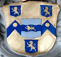 Arms of Rolle: Or, on a fesse dancetté between three billets azure each charged with a lion rampant of the first three bezants