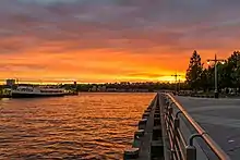 Pier 63 was originally located near 23rd Street, adjacent to Chelsea Piers and Hudson River Park. The site was formerly the location of a Pavonia Ferry terminal that opened in 1869. The ferries traveled to Jersey City, located opposite Manhattan.[78] By the beginning of the 20th century ferries were already aging and deteriorating under heavy use,[79] and in 1942 the terminal itself was demolished.[80] The pier then housed a Baltimore and Ohio Railroad transfer barge. In the late 1980s, boat enthusiast John Krevey converted an old railroad barge on the Hudson River to Pier 63.[81] A restaurant was opened on the pier. The lightship Frying Pan and the fire vessel John J. Harvey were also originally moored to Pier 63,[82] with both listed on the National Register of Historic Places.[83] In 2007, the barge was moved to Pier 66 on 26th Street.[84]
