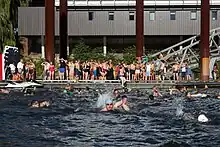 Established in 2012,[73] the River Hugger Swim Team is an open water "recreational protest swim" bringing attention to the extreme deficit of water edge access in Portland.[74] The group's goal is to swim together as a pod and create awareness to commuters and people utilizing the Eastbank Esplanade that it is safe to swim in the Willamette River.[75] In 2018, Wheeler joined nearly 40 swimmers to kick off the HAP's swim season for its River Hugger team.[76][77] In early mornings, they swim across the river. In the afternoons, when river traffic is heavier, they swim from the Hawthorne Bridge to the Morrison Bridge and back, sometimes multiple times. Each length (bridge to bridge) is roughly one third of a mile.[78]