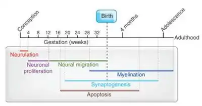 Cortical white matter increases from childhood (~9 years) to adolescence (~14 years), most notably in the frontal and parietal cortices.[8] Cortical grey matter development peaks at ~12 years of age in the frontal and parietal cortices, and 14–16 years in the temporal lobes (with the superior temporal cortex being last to mature), peaking at about roughly the same age in both sexes according to reliable data. In terms of grey matter loss, the sensory and motor regions mature first, followed by other cortical regions.[8] Human brain maturation continues to around 20[9] to 25[10] and even up to 30[11] years of age and beyond. Although it is worth noting that there is no actual evidence suggesting that impulse control only finishes developing in humans in the twenties. It is a common misconception that the brain only fully develops by 25, as the number comes from two particular studies, one on psychosocial maturity, where greater than 50% of people being tested only reached a plateau in impulse control by the age of 25. However, some people were recorded to have reached adult-levels by mid-teens, and some had not reached it even after 30. It is worth noting that the majority of countries showed that people's impulse control linearly improved with age, suggested that most cutoffs are somewhat arbitrary. It is also believed to have originated from a study by Jay Giedd based on MRI data, scanning the brains of people aged up to 21 or 25 years and no participants that were older. Years of research and testing seem to indicate that the brain is functioning in full adult capacity by the time youths reach high school, or roughly the age range of 14-16. Though it is a controversial psychometric, adult IQ also begins to be tested around this age range, with the Raven's Progressive Matrices test beginning at age 14 and the Wechsler Adult Intelligence Scale test beginning at age 16, though scores between 14 and 16 on the Weschler test have differences so small that they are considered unreliable. This may bring into question the effectiveness of brain development studies in treating and successfully rehabilitating criminal youth.[12]