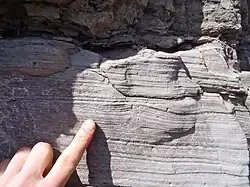 Hummocky cross-stratification from the Arisag Formation (Silurian), Nova Scotia.