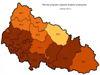 The Hungarians in Ukraine (Hungarian: Ukrajnai magyarok, Ukrainian: угорці в Україні, tr. uhortsi v Ukraini) number 156,600 people according to the Ukrainian census of 2001 and are the third largest national minority in the country. Hungarians are largely concentrated in the Zakarpattia Oblast (particularly in Berehove Raion and Berehove city), where they form the largest minority at 12.1% of the population (12.7% when native language is concerned). In the area along the Ukrainian border with Hungary (the Tisza River valley), Hungarians form the majority.