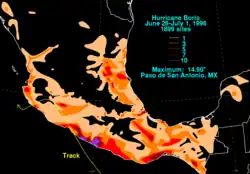 A total of about 10,000 people were left homeless, and at least 70 people were injured.[5] Damage is unknown.[4] Rain was heavy throughout the impacted region, with the highest totals in Guerrero. A total of 12.16 inches (309 mm) was recorded in Coyuca de Benítez.[1] The highest total was 14.98 inches (380 mm) at Paso de San Antonio, to the east of the point of landfall.[6] Those rains caused a flood on the San Jeronimo River, which left at least 5000 homeless. In Tecpan, a countless number of homes were washed away.[1] Winds went as high as 90 miles per hour (140 km/h).[7] The storm flooded lobbies of hotels along the coast. Approximately 12 boats were sunk offshore. Tecpan bore the brunt of the storm, reporting heavy damage.[8] The area was impacted by Hurricane Alma just a few days before.[9] On July 18, President Zedillo held meetings with the victims of Boris and Cristina, a later storm in the same season, in Tecpan and Acapulco.[10]