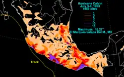 Due to the storm's large size, Hurricane Calvin was responsible for heavy flooding along much of the coast of Mexico, and after moving onshore as a hurricane, two locations (El Marques, Japala Del) reported as high as 18.27 in (464 mm) of rain.[18] The flooding led to mudslides, killing 28 people on land, with 30,000 people displaced.[19] Most of the casualties were indirect.[20] In all, 37 people perished due to Hurricane Calvin.[21] Nationwide 42,063 people were evacuated from their homes.[22] Numerous seaside restaurants were washed off their respective foundations.[23] Banana, mango, and corn plantations were also destroyed by the strong winds.[24] Coconut trees were reportedly brought down as well.[25]