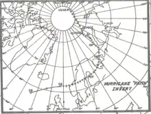 At 00:00 UTC on August 29, Faith attained its maximum sustained winds of 125 mph (201 km/h).[2] After reaching maximum sustained winds late on August 29, Faith began to gradually weaken and decreased to Category 2 hurricane intensity early on August 30.[2] By that time, the storm turned to the northeast around the periphery of an Atlantic subtropical anticyclone while located about midway between Bermuda and Florida.[1][4] Faith remained well offshore of the East Coast of the United States and Atlantic Canada, after veering eastward on September 1.[2] Thereafter, it began to accelerate and eventually curved northeastward.[1] While approaching Europe, Faith's forward speed increased to as much as 50 mph (80 km/h). At 0600 UTC on September 3, a minimum barometric pressure of 950 mbar (28 inHg) was recorded the lowest in relation to the storm. After remaining a Category 2 hurricane since August 29, Faith weakened slightly to a Category 1 hurricane early on September 6, as it neared the Faroe Islands.[2] Crossing the North Sea, Faith finally transitioned into an extratropical storm at 1200 UTC later that day, while centered about 125 miles (201 km) east-northeast of Tórshavn.[2][1][5] The extratropical remnants of Faith headed eastward and affected Norway with winds as high as 60 mph (97 km/h).[2] Tracking over Scandinavia, the extratropical storm weakened to the equivalent of a tropical depression before entering the Soviet Union (present day Russia). Eventually, the storm degenerated into an extratropical low pressure area, curved northward, and retained its identity until September 15,[6] when it was over Franz Josef Land, which is roughly 600 miles (970 km) from the North Pole.[5]
