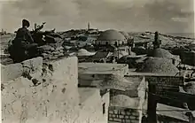 On May 27, el-Tell, after receiving no answer to his proposition, told his men to "Get the Hurva Synagogue by noon." Fawzi el-Kutub executed the mission by placing a 200-litre barrel filled with explosives against the synagogue wall. The explosion resulted in a gaping hole and Haganah fighters spent forty-five minutes fighting in vain to prevent the Legionnaires from entering. When they finally burst through, they tried to reach the top of its dome to plant an Arab flag. Three were shot by snipers, but the fourth succeeded. The Arab flag flying over the Old City skyline signaled the Legion's triumph. Photographs show that the dome of the synagogue was badly damaged during the fighting.[51] After taking the synagogue, the Arab Legion blew up what remained.[51] A huge explosion reduced the 84-year-old synagogue, together with the Etz Chaim Yeshiva attached to it, to rubble.[49] The Jewish defenders of the Old City surrendered the following day.
