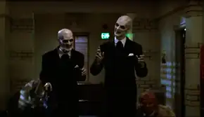 The Gentlemen, called the "creepiest villains we've ever done" by series writer Doug Petrie,[2] were inspired by a nightmare Whedon had as a child, specifically one in which he was in bed and approached by a floating monster. Whedon fashioned The Gentlemen as something from a Brothers Grimm fairy tale, intending them to be frightening to children — monsters who carve out people's hearts, smiling as they do so. Nosferatu, Pinhead from Hellraiser, and Mr. Burns from The Simpsons all served as physical models for The Gentlemen. Elegantly Victorian in costume and demeanor, Whedon found their politeness and grace especially unsettling. Their metallic teeth were inspired by the intersection of Victorian culture with the height of the Industrial age,[3] an era that Whedon considers "classically creepy".[1] For Buffy studies scholar Rhonda Wilcox, The Gentlemen and their straitjacket-wearing minions, who clumsily flap, gyrate, and crouch as they move, are representative of class disparity and patriarchy: The Gentlemen, with their Victorian suits, move effortlessly to accomplish what they set out to do while their minions, whom Whedon called "footmen", do the "dirty work".[2][4]