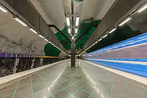 Huvudsta metro station is a station on the blue line of the Stockholm metro, located in Huvudsta, Solna Municipality. The station was opened on 18 August 1985 as part of the extension between Västra skogen and Rinkeby.[2] The distance to Kungsträdgården is 5.2 km (3.2 mi).