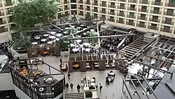 With the design and opening of the Hyatt Regency Atlanta in 1967, the Hyatt Regency brand trademark became its open atriums containing trees, waterfalls, and glass elevators, aiming to be tourist attractions of their own.[4] The Bayshore Highway Hyatt became the Hyatt Regency Burlingame and underwent reconstruction in the 1980s, with $90 million spent to re-open in 1988 with around 800 rooms over 10 floors.[5] In 1989, the hotel's distinct appearance was described in Building Design and Construction, explaining that it has "an 182-ft. by 182-ft. space frame that is covered by a Teflon-coated fiberglass fabric" and a "glass daylight system ... attached to its perimeter."[6][7]