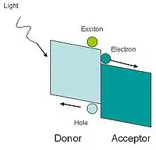 In hybrid solar cells, an organic material is mixed with a high electron transport material to form the photoactive layer.[2] The two materials are assembled together in a heterojunction-type photoactive layer, which can have a greater power conversion efficiency than a single material.[3] One of the materials acts as the photon absorber and exciton donor. The other material facilitates exciton dissociation at the junction. Charge is transferred and then separated after an exciton created in the donor is delocalized on a donor-acceptor complex.[4][5]