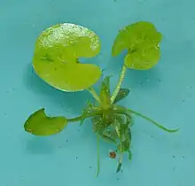 Hydrocharis morsus-ranae L. is a species of the genus Hydrocharis known by the common name European frog-bit. It is a free-floating flowering plant that bears small white flowers. "Morsus-ranae" means "frog bite" in Latin, and it is part of this species' scientific name because frogs might seen as biting on the leaves.[1] European frog-bit is often mistaken for an American frog-bit (Limnobium spongia) due to their similar looks and floating freely.[2] It usually displays invasive behavior in Canada and North America, having a major impact on native ecosystems. However, European frog-bit is efficient in accumulating high concentrations of heavy metals and chemicals, removing waste from water.[3]