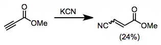 Generally acidic conditions favor 1,2-adducts, while basic conditions favor 1,4-adducts. Additions of alkali metal cyanides, for instance, lead exclusively to 1,4-addition.[8] In contrast to alkali metal cyanides and cyanoaluminates, Lewis acidic cyanides, such as TMSCN, favor 1,2-addition. Acetylenic substrates undergo the reaction; however the scope of this reaction is limited and yields are often low.[9]