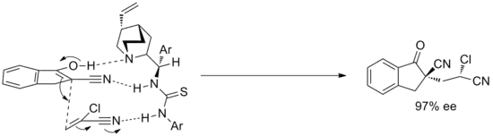 Asymmetric Michael addition to a nitro-olefin by hydrogen bond catalysis developed by Takemoto. The thiourea hydrogen bonds to the nitro group and stabilizes the incoming negative charge, while the amine acts a specific base to activate the nucleophile. This is an example of bifunctional catalysis.