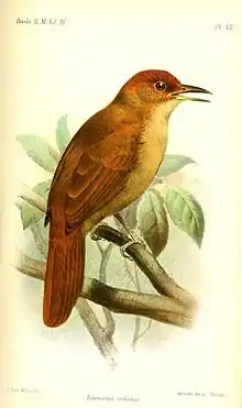 The henna-capped foliage-gleaner has previously been placed in genera Automolus and Hypocryptus but genetic data place it firmly in Clibanornis. It and the canebrake groundcreeper (c. dendrocolaptoides) are sister species.[4][5]