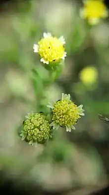 Hymenoxys texana is an annual herb with delicate reddish or purplish stems growing only 10 or 15 centimeters (4-6 inches) tall. The leaves have rubbery, glandular blades which may be simple or divided into lobes, particularly at mid-stem. The inflorescence is a solitary flower head or an open cluster of several heads. Each head is under a centimeter wide and has 6 to 8 yellow ray florets each 2 or 3 millimeters long.[3] The ray florets are often tucked behind the phyllaries. The center of the head has 30–75 tiny disc florets.[4]