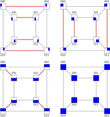 -dimensional hypercube is a network topology for parallel computers with processing elements. The topology allows for an efficient implementation of some basic communication primitives such as Broadcast, All-Reduce, and Prefix sum.[1] The processing elements are numbered through . Each processing element is adjacent to processing elements whose numbers differ in one and only one bit. The algorithms described in this page utilize this structure efficiently.