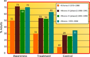 169. Ostchega Y, Dillon CF, Hughes JP, Carroll M, Yoon S (July 2007). "Trends in hypertension prevalence, awareness, treatment, and control in older U.S. adults: data from the National Health and Nutrition Examination Survey 1988 to 2004". Journal of the American Geriatrics Society. 55 (7): 1056–1065. doi:10.1111/j.1532-5415.2007.01215.x. PMID 17608879. S2CID 27522876.