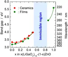 Pure single crystals of β-LiGaO2 with a length of several inches can be grown by the Czochralski method. Their cleaved surfaces have lattice constants that match those of ZnO and GaN and are therefore suitable for epitaxial growth of thin films of those materials. β-LiGaO2 is a potential nonlinear optics material, but its direct bandgap of 5.6 eV is too wide for visible light applications. It can be reduced down to 3.2 eV by alloying β-LiGaO2 with ZnO. The bandgap tuning is discontinuous because ZnO and β-LiGaO2 do not mix but form a Zn2LiGaO4 phase when their ratio is between ca. 0.2 and 1.[3]