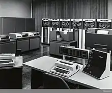 IBM 7010 system: console (in front), disc drives and processing modules (left), tape storage, punch card reader and printer (right)