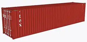 A 40-foot-long (12.2 m) shipping container. Each of its eight corners has an essential corner casting for hoisting, stacking, and securing