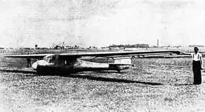It was an all-wood aircraft. The two part wing had a rectangular plan central section and gently tapering trapezoidal outer panels with blunted tips. Each part was built around a single plywood D-box spar which formed the leading edge. On each side an internal auxiliary drag strut ran diagonally from the spar at about mid-span to the rear of the wing root and the whole area between spar and strut was ply-covered, forming another box. Elsewhere, the wings were fabric-covered, as were the differential ailerons which filled the trailing edges of the outer panels. The wing bracing was unusual, with the normal rigid struts replaced by upper and lower steel ribbons on each side. Each upper ribbon ran from a central cabane, formed from three steel tubes, to a reinforced region of the spar. The lower ribbons ran from the spars to the lower fuselage. They offered less air resistance and also provided a way to measure wing loads in flight.[1][2]