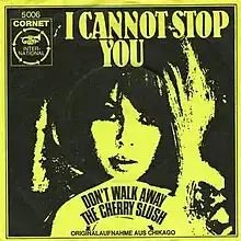 "I Cannot Stop You" is the second single by the American garage rock band, The Cherry Slush, written by Dick Wagner, and released in January 1968 initially on Coconut Groove Records. The song is arguably the group's most known recording, distinguished by the composition's use of the Hammond B3 organ and a horn instrumental played by the session musician, Don Sheets. Recording began at Audio Recorders Studio, in Cleveland, when the band was still working as the Bells of Rhymny. For the track, Gene Bruce swapped lead guitar with the keyboard player Mark Burdick.[1][2]
