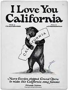 In 1951, the State Legislature passed a resolution designating it as California's state song. California Government Code section 421.7 states, "I Love You, California", a song published in 1913 with lyrics by F.B. Silverwood and music by A.F. Frankenstein, is an official state song."[8]