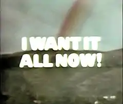 I Want It All Now! is a 1978 American documentary television special produced by NBC News about Marin County, California and the hedonistic and narcissistic lifestyle ostensibly characteristic of the affluent county. The program also explored the popularity of the human potential movement and new age ideologies in Marin, social problems such as suicide, alcoholism, and divorce associated with the Marin lifestyle, and the effect that this had on children growing up there.[1][2][3] The program presented Marin as at the forefront of trends that were becoming more predominant in the larger American society in the late 1970s, and it represented an early snapshot of the lifestyle that a few years later would be termed "yuppie".[4]