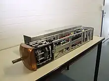 The first prototype IceMole is a pencil-shaped craft that is designed to autonomously deploy and dig itself into ice. It is a square tube of 225 cm2 (34.9 sq in) cross section. It has a 3 kW (4.0 hp) melting head at the tip which has differential heating in different parts. The robot is powered by a power generator on the surface and is attached by means of a cable, which relays the power supply, communication and data signals. The IceMole utilizes a 6 cm (2.4 in) long screw at its heated head that keeps firm contact while drilling with the ice being melted. The IceMole has separately controllable heating elements that can be manipulated to obtain differential heating. The differential heating permits the gradual change of direction.[1][2][3]