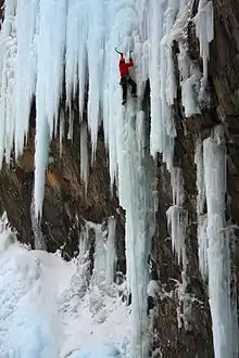 Ice climbing involves using specific pieces of specialized equipment, namely ice tools and crampons, to ascend routes consisting of frozen water ice. As with rock climbing, ice climbing can be done as free climbing (i.e. no additional artificial or mechanical device to aid progression outside of the ice tools and crampons), and performed in pairs, where the lead climber places protection into the route as they ascend. The second climber (or belayer), removes this temporary climbing protection as they climb the route after the lead climber has reached the top.[1][2]