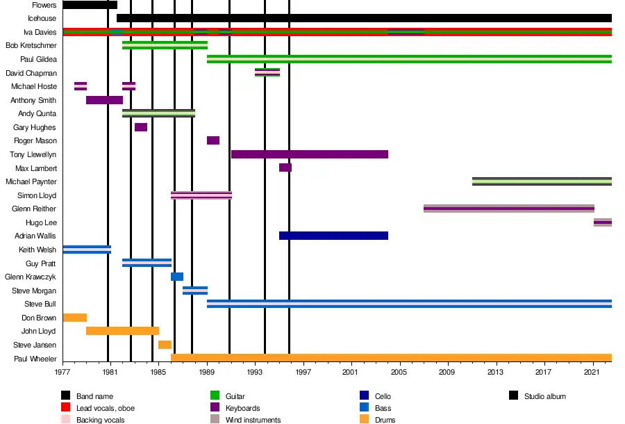 Icehouse are an Australian rock band, formed in Sydney in 1977 as Flowers. Initially known in their homeland for their pub rock style, the band later achieved mainstream success playing new wave and synth-pop music and attained Top 10 singles chart success locally and in both Europe and the U.S.[1] The mainstay of both Flowers and Icehouse has been Iva Davies (singer-songwriter, record producer, guitar, bass, keyboards, oboe)[2] supplying additional musicians as required. The name "Icehouse", adopted in 1981, comes from an old, cold flat Davies lived in and the strange building across the road populated by itinerant people.[3]